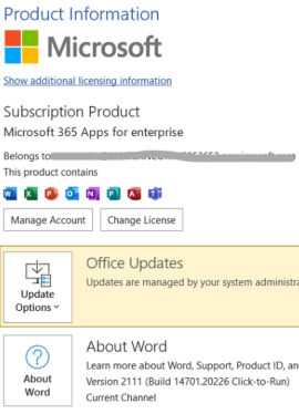 - 운영 체제 버전과 Excel 버전을 공유해 주십시오. Excel 버전의 경우 Excel > 파일 > 계정으로 이동하여 아래와 같이 스크린샷을 찍습니다.