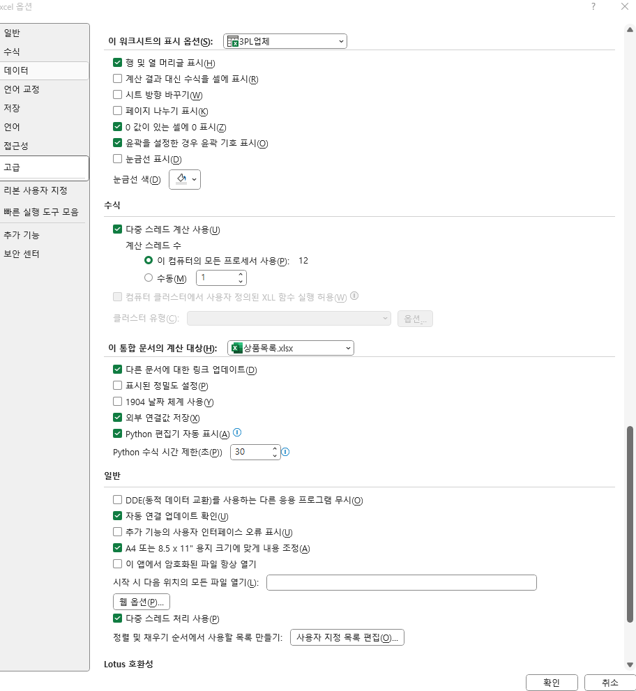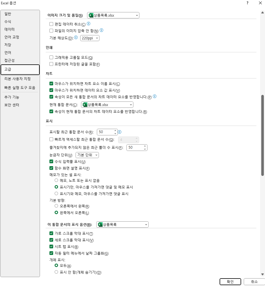 현재 제 엑셀에 고급에 있는 목록입니다.