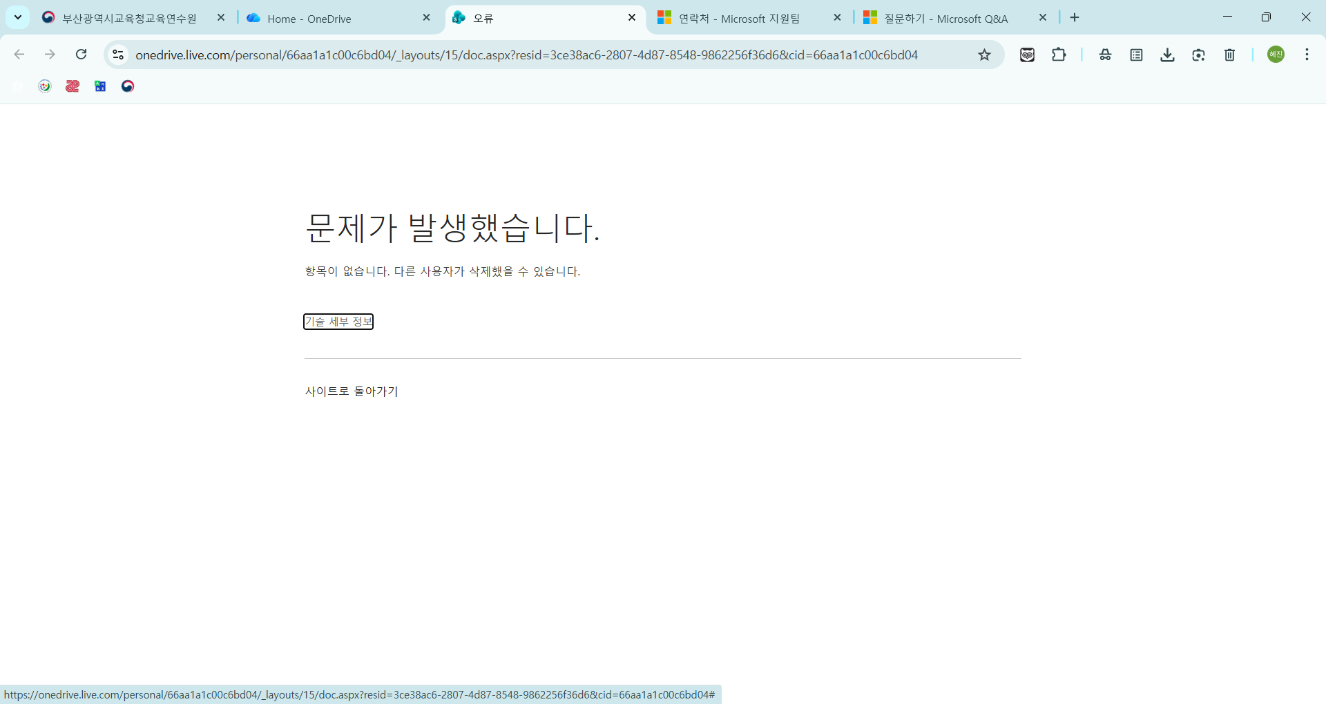 첫 번째 이미지의 “문제가 발생했습니다”는 웹 오류입니다. 로그아웃 후 브라우저 캐시를 지우고 다시 로그인하세요. 반복되면 Microsoft 서비스 상태를 확인하세요.