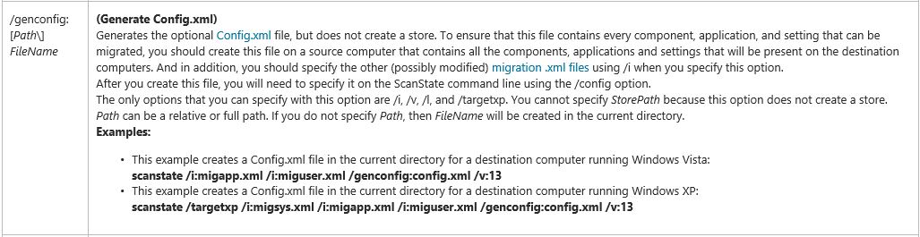 Scanstate.exe /genconfig:Config.XML /i:MigUser.xml /i:MigApp.xml