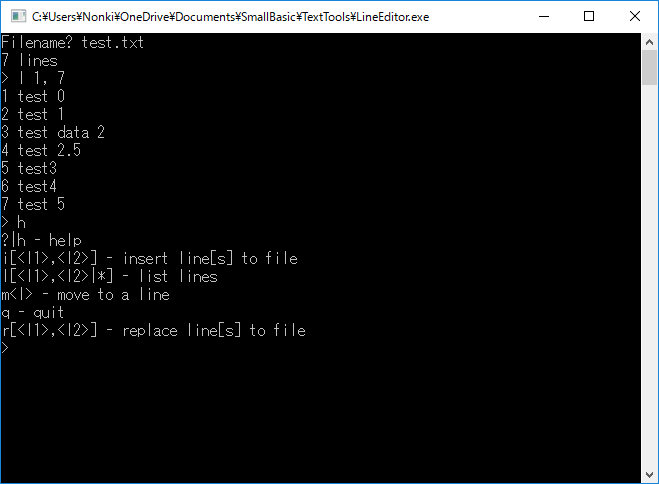 TextWindow.WriteLine("i[<l1>,<l2>] - insert line[s] to file")