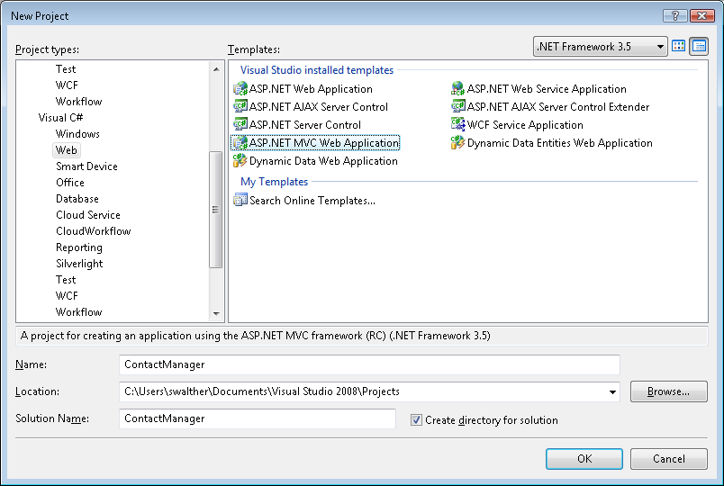 새 프로젝트 대화 상자의 오른쪽 위에 있는 드롭다운 목록에서 .NET Framework 3.5를 선택했는지 확인합니다. 그렇지 않으면 ASP.NET MVC 웹 애플리케이션 템플릿이 표시되지 않습니다.