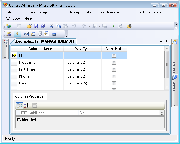 첫 번째 열인 ID 열은 특수합니다. ID 열을 ID 열 및 기본 키 열로 표시해야 합니다. 열 속성을 확장하고(그림 6의 아래쪽을 보면) ID 사양 속성까지 아래로 스크롤하여 열이 ID 열임을 나타냅니다. (Is Identity) 속성을 Yes 값으로 설정합니다.