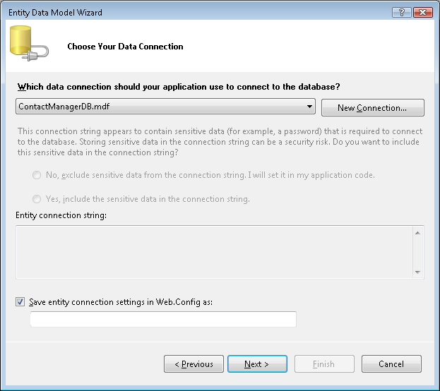 4. 데이터 연결 선택 단계에서 ContactManagerDB.mdf 데이터베이스를 선택하고 엔터티 연결 설정에 대한 ContactManagerDBEntities 이름을 입력합니다(그림 8 참조).