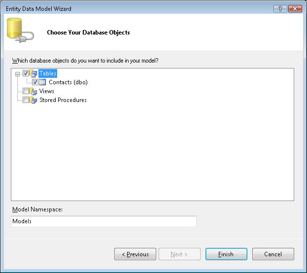 5. 데이터베이스 개체 선택 단계에서 테이블 레이블이 지정된 확인란을 선택합니다(그림 9 참조). 데이터 모델에는 데이터베이스에 포함된 모든 테이블(연락처 테이블이 하나만 있습니다)이 포함됩니다. 네임스페이스 모델을 입력합니다. 마침 단추를 클릭하여 마법사를 완료합니다.