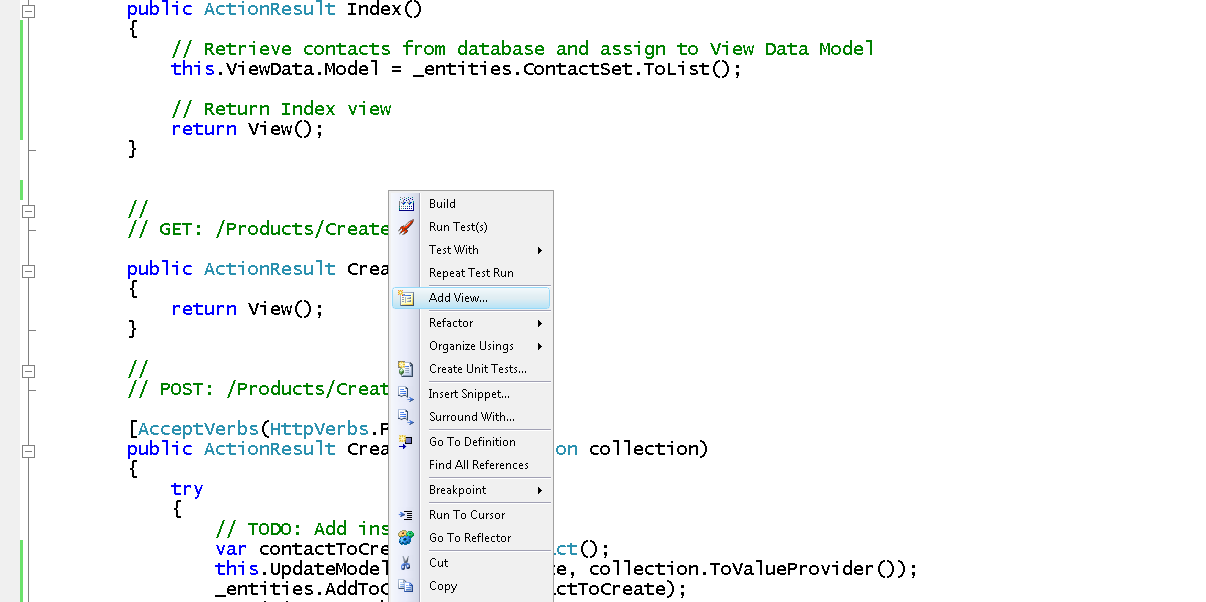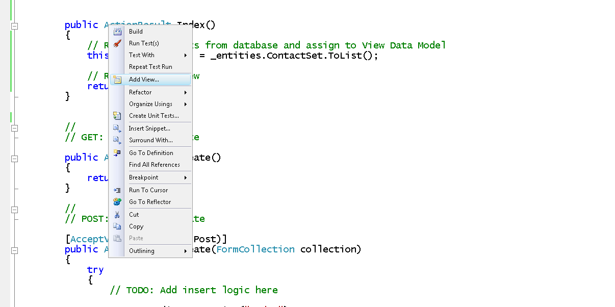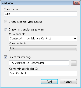 편집() 메서드를 마우스 오른쪽 단추로 클릭하고 메뉴 옵션 보기 추가를 선택하여 편집 양식이 포함된 보기를 생성할 수 있습니다. 보기 추가 대화 상자에서 ContactManager.Models.Contact 클래스 및 보기 콘텐츠 편집 을 선택합니다(그림 19 참조).