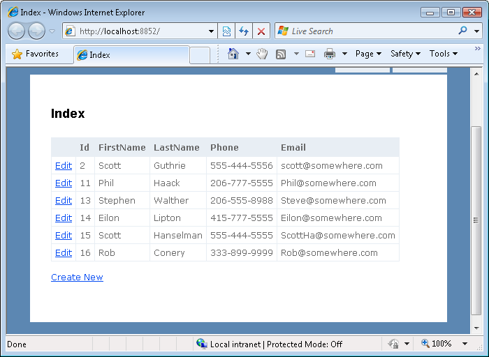 아쉽게도 애플리케이션에 몇 가지 문제가 있습니다. 첫째, 나는 이것을 인정 주저, 연락처 관리자 응용 프로그램은 가장 매력적인 응용 프로그램이 아니다. 몇 가지 디자인 작업이 필요합니다. 다음 반복에서는 애플리케이션의 모양을 개선하기 위해 기본 보기 master 페이지 및 계단식 스타일시트를 변경하는 방법을 살펴보겠습니다.