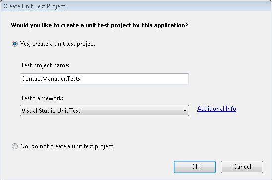 그림 02: 단위 테스트 프로젝트 만들기 대화 상자(전체 크기 이미지를 보려면 클릭)