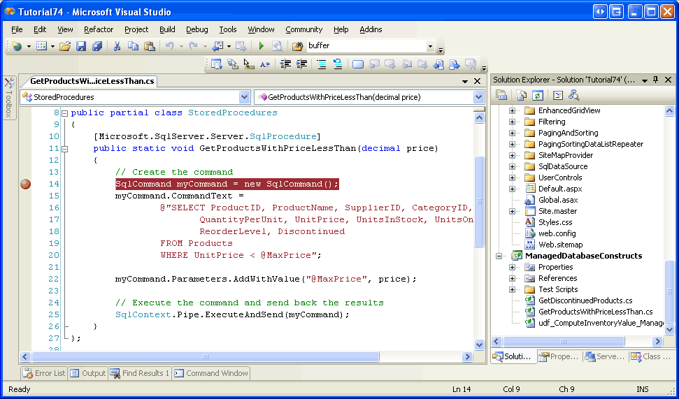 관리되는 저장 프로시저를 GetProductsWithPriceLessThan 디버그하려고 했습니다. 먼저 메서드 코드 GetProductsWithPriceLessThan 내에서 중단점을 설정합니다.