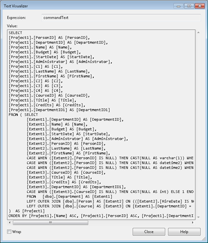 성능 문제를 조사할 때 Entity Framework가 데이터베이스에 보내는 정확한 SQL 명령을 아는 것이 도움이 되는 경우가 있습니다. 개체로 작업하는 IQueryable 경우 이 작업을 수행하는 한 가지 방법은 메서드를 ToTraceString 사용하는 것입니다.