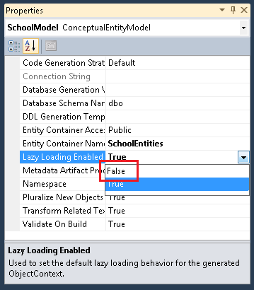 SchoolModel.edmx 데이터 모델을 열고 디자인 화면을 클릭한 다음 속성 창에서 지연 로드 사용 속성을 로 False설정합니다. 데이터 모델을 저장하고 닫습니다.