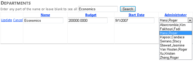 Departments.aspx 페이지를 실행하여 이전과 같이 작동하는지 확인합니다. 메서드는 GetInstructorNames 관리자 드롭다운 목록을 채우기 위해 호출되며 GetDepartmentsByAdministrator , 둘 이상의 부서의 관리자가 강사가 없는지 확인하기 위해 업데이트를 클릭하면 메서드가 호출됩니다.