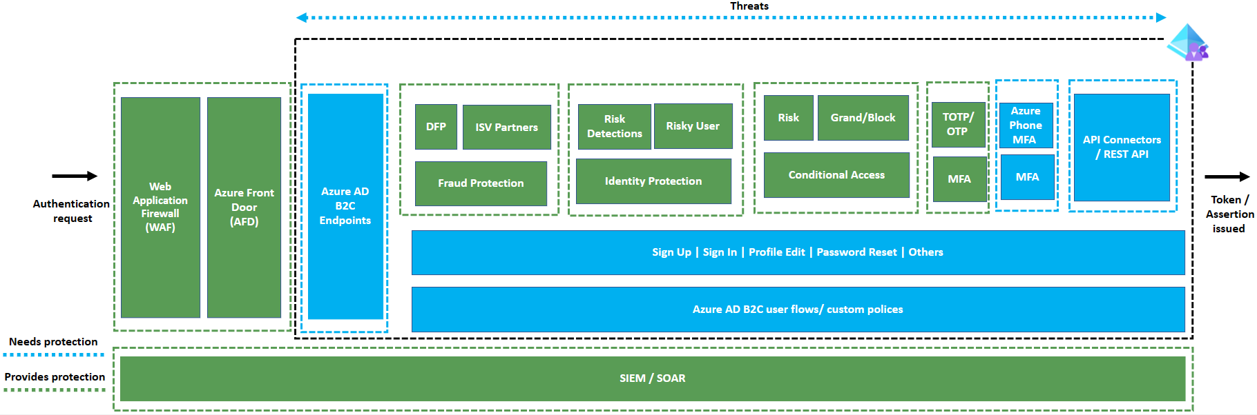 Azure AD B2C를 사용하면 API 커넥터 또는 REST API 기술 프로필을 사용하여 외부 시스템에 연결할 수 있습니다. 이러한 인터페이스를 보호해야 합니다. Azure AD B2C 인증 엔드포인트를 보호하여 REST API에 대한 악의적인 요청을 방지할 수 있습니다. WAF 및 AFD를 사용하여 이러한 엔드포인트를 보호할 수 있습니다.