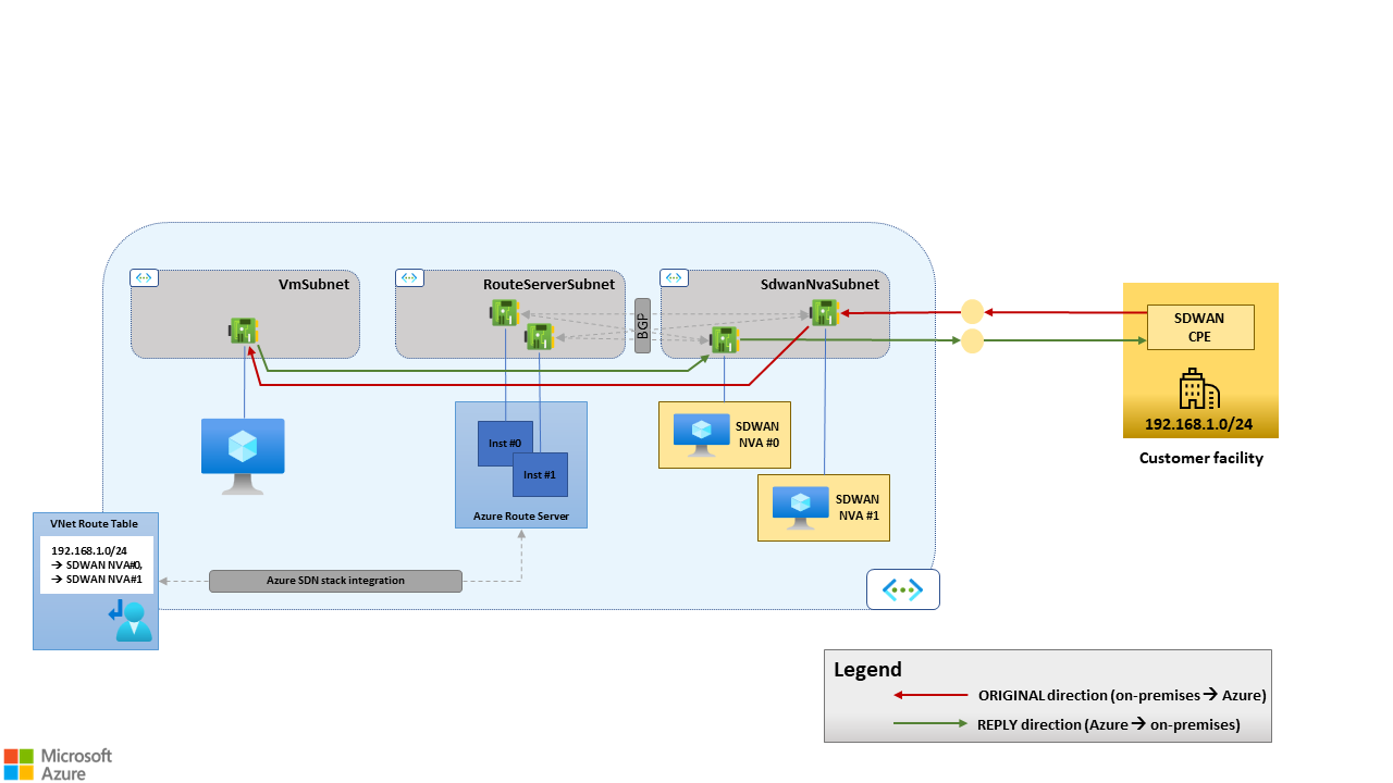 그림 5. 활성/활성 HA 아키텍처의 비대칭 라우팅입니다. SD-WAN NVA #0 및 SD-WAN NVA #1은 경로 서버에 대한 경로 길이가 동일한 대상 192.168.1.0/24(원격 SD-WAN 사이트)에 대해 동일한 경로를 발표합니다. 원래 흐름(SD-WAN 원격 사이트에서 Azure로, 빨간색 경로)은 NVA #1을 SD-WAN Azure 쪽에서 종료된 터널을 통해 라우팅됩니다. 온-프레미스 SD-WAN CPE는 이 터널을 선택합니다. Azure SDN 스택은 가상 네트워크의 경로 테이블에 따라 REPLY 흐름(Azure에서 원격 SD-WAN 사이트, 녹색 경로)을 SD-WAN NVA #0으로 라우팅합니다. 이 흐름은 가상 네트워크의 경로 테이블에 따라 192.168.1.0/24에 대한 가능한 다음 홉 중 하나입니다. Azure SDN 스택에서 선택한 다음 홉이 원래 흐름을 받은 CPE와 항상 동일한 SD-WAN 보장하지는 않습니다.