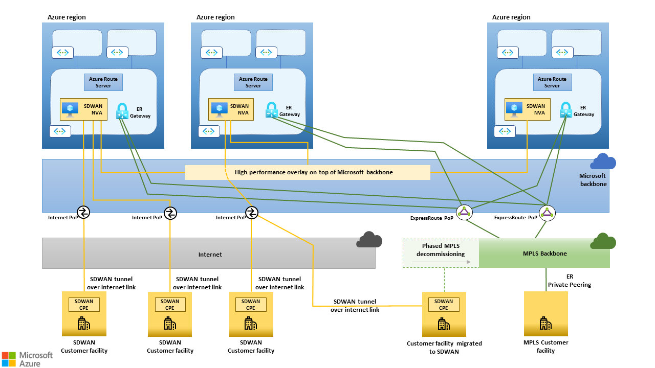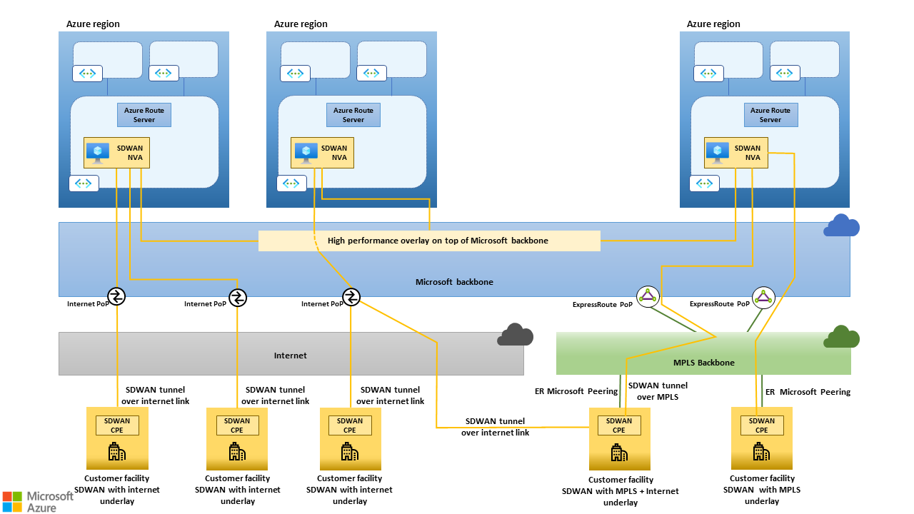 다음 섹션에서는 판독기에서 SD-WAN 패러다임 의 기본 사항과 Microsoft 백본의 아키텍처를 잘 알고 있다고 가정합니다. Microsoft 백본은 Azure 지역을 서로 및 공용 인터넷과 상호 연결합니다.