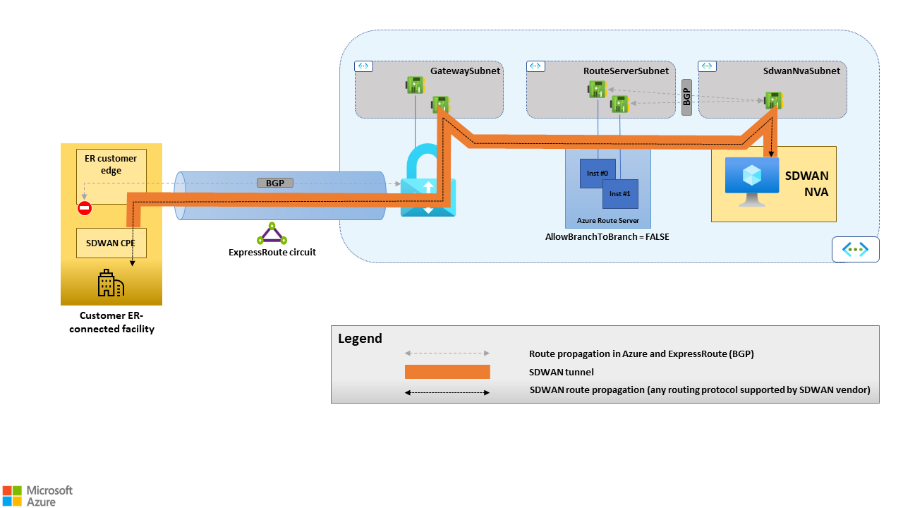 ExpressRoute 프라이빗 피어링을 언더레이로 사용하는 경우 모든 온-프레미스 SD-WAN 사이트는 Azure의 SD-WAN 허브 NVA에 대한 터널을 설정합니다. 이 시나리오에서는 SD-WAN NVA와 ExpressRoute 가상 네트워크 게이트웨이 간의 경로 전파가 필요하지 않습니다(즉, 경로 서버는 "AllowBranchToBranch" 플래그를 false로 설정하여 구성해야 함).