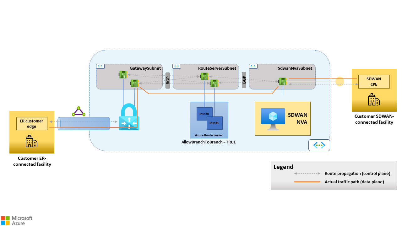 이 공존 시나리오에서는 SD-WAN에 연결된 사이트와 ExpressRoute 회로에 연결된 사이트 간에 트래픽을 라우팅할 수 있도록 Azure에 배포된 SD-WAN NVA가 필요합니다. 여기에 설명된 대로 Azure에서 ExpressRoute 가상 네트워크 게이트웨이와 SD-WAN NVA 간에 경로를 전파하도록 AllowBranchToBranch 경로 서버를 구성할 수 있습니다. ExpressRoute 가상 네트워크 게이트웨이와 SD-WAN NVA 간의 경로 전파는 BGP를 통해 발생합니다. Route Server는 둘 다로 BGP 세션을 설정하고 서로 학습된 경로를 각 피어에 전파합니다. 플랫폼은 Route Server와 ExpressRoute 가상 네트워크 게이트웨이 간의 BGP 세션을 관리합니다. 사용자는 명시적으로 구성할 필요가 없지만 경로 서버를 배포할 때만 플래그를 사용하도록 설정합니다 AllowBranchToBranch .