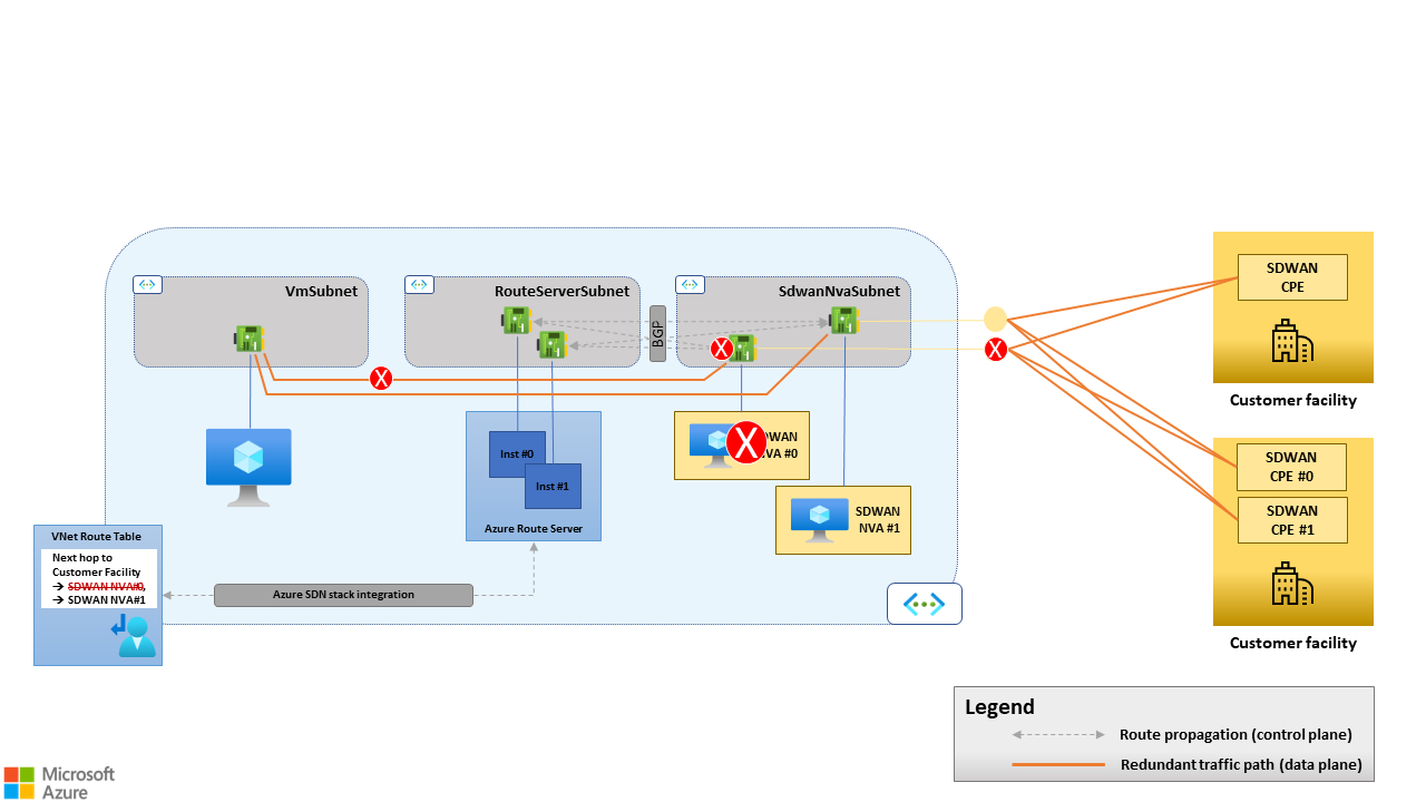 여러 SD-WAN NVA를 사용하고 경로 서버와 피어링하는 경우 BGP는 장애 조치(failover)를 구동합니다. SD-WAN NVA가 오프라인 상태가 되면 경로 서버에 대한 경로 보급을 중지합니다. 실패한 디바이스에서 학습된 경로는 가상 네트워크의 경로 테이블에서 철회됩니다. 따라서 SD-WAN NVA가 디바이스 자체 또는 언더레이에서 오류로 인해 원격 SD-WAN 사이트에 더 이상 연결을 제공하지 않는 경우 더 이상 가상 네트워크의 경로 테이블의 원격 사이트에 대한 가능한 다음 홉으로 표시되지 않습니다. 모든 트래픽은 나머지 정상 디바이스로 이동합니다. SD-WAN NVA와 Route Server 간의 경로 전파에 대한 자세한 내용은 BGP 피어에서 Route Server로 보급된 경로를 참조하세요.