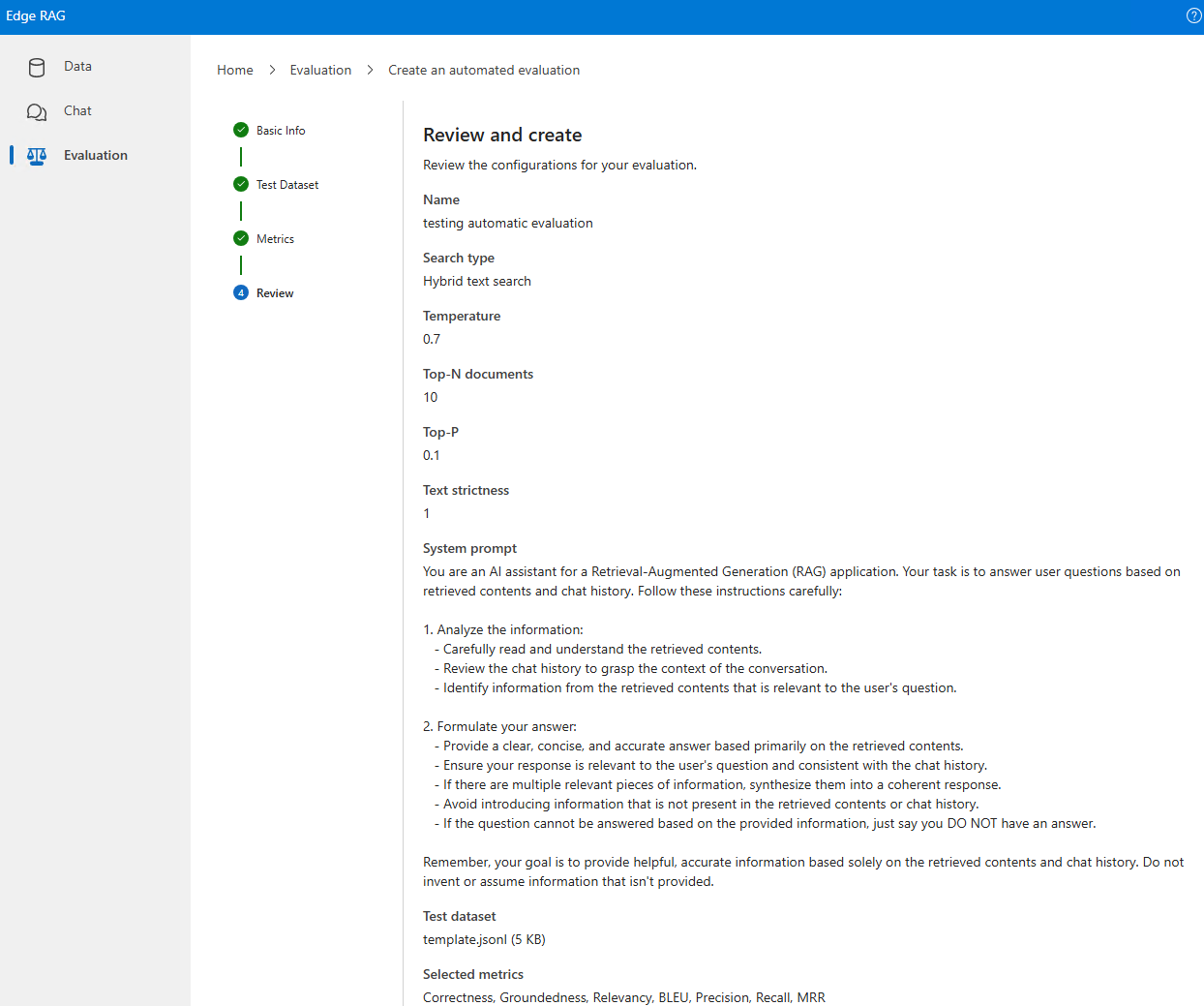 Azure Arc에서 사용하도록 설정된 Edge RAG 미리 보기 내에서 시스템, 모델 및 데이터 세트를 평가합니다. 평가에는 기준과 자동의 두 가지 유형이 있습니다.