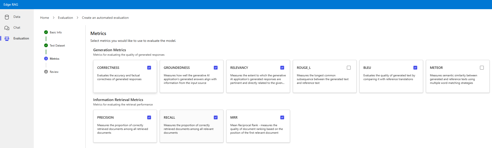 RAG 시스템에 대해 평가하려는 메트릭을 선택합니다.