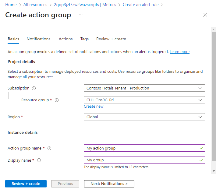 작업 그룹에 대한 구독 및 리소스 그룹을 선택하고. 포털에 표시되는 작업 그룹 이름과 이메일 및 SMS 알림에 표시되는 표시 이름을 지정합니다.