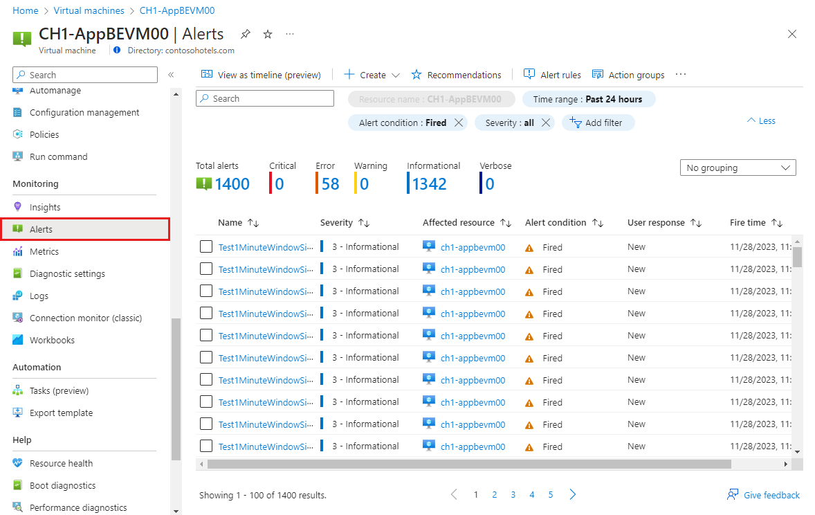 리소스의 메뉴에서 경고를 선택합니다. 리소스에 열려 있는 경고가 있는 경우, 그것들은 보기에 포함됩니다.