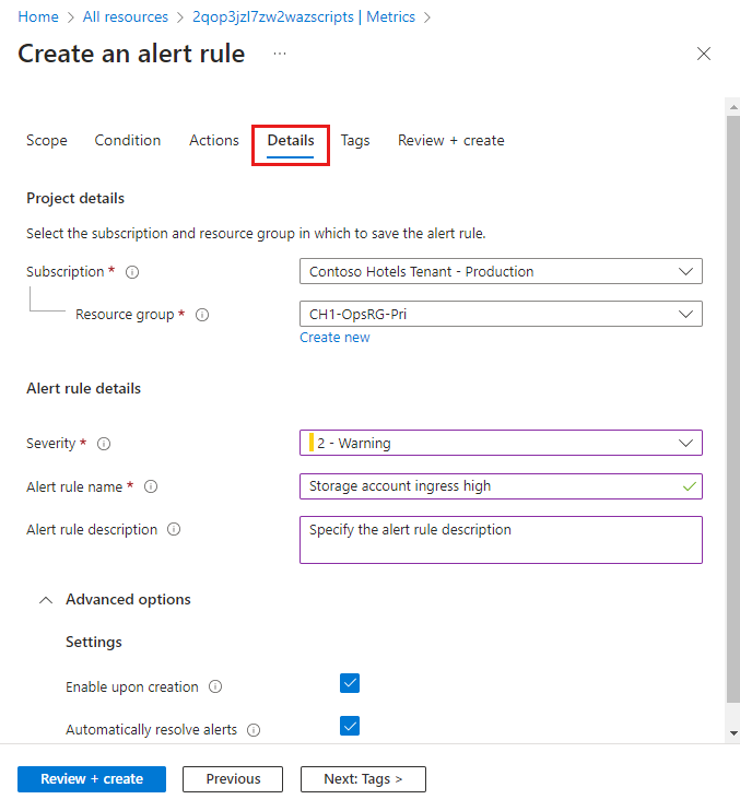 세부 정보 탭을 선택하고 경고 규칙에 대한 다양한 설정을 구성합니다.