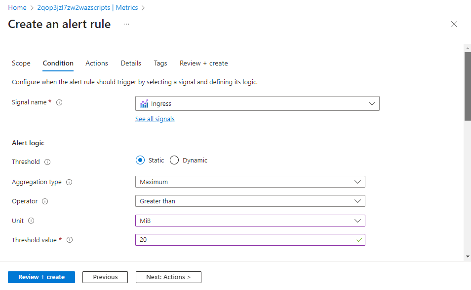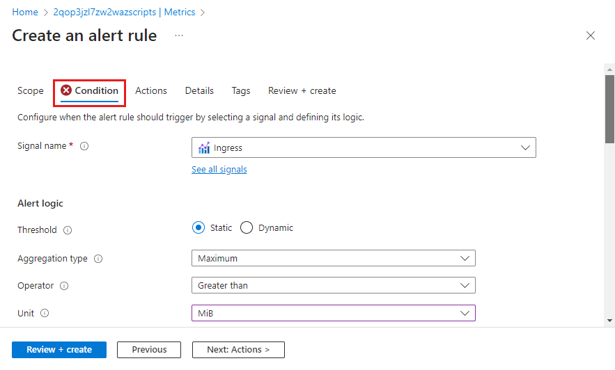 리소스가 이미 선택되어 있습니다. 경고 규칙에 대한 임계값 및 기타 세부 정보를 지정하도록 신호 논리를 수정해야 합니다.