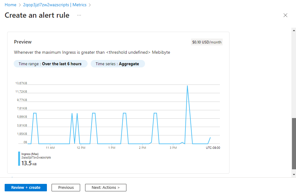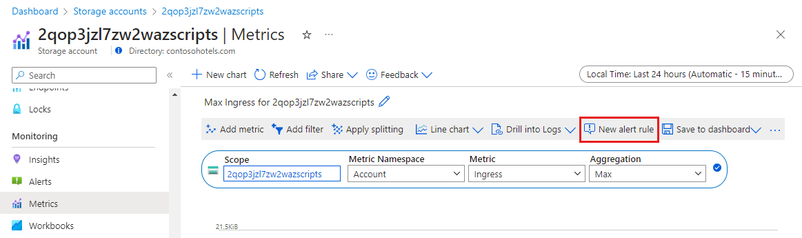 메트릭 탐색기에서 새 경고 규칙을 클릭합니다. 규칙은 메트릭 탐색기에서 선택한 대상 개체 및 메트릭을 사용하여 미리 구성됩니다.