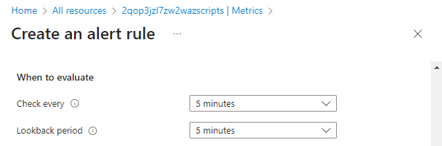 기본 시간 세분성을 그대로 적용하거나 요구 사항에 맞게 수정할 수 있습니다. 매번 확인은 경고 규칙이 조건이 충족되는지를 확인하는 빈도를 정의합니다. 되돌아보기 기간은 수집된 값이 집계되는 시간 간격을 정의합니다. 예를 들어 5분마다 지난 5분을 살펴보겠습니다.