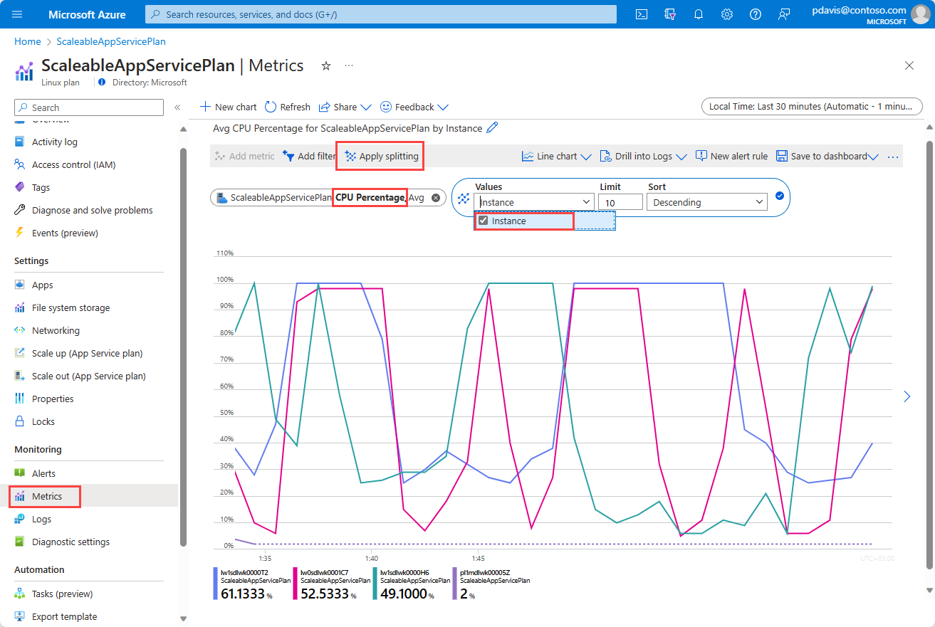이 차트에는 App Service 요금제에 대한 CPU 사용량이 적절한 범위 내에 포함되는지 여부가 표시되며 인스턴스별로 구분된 CPU 사용률이 제공되므로 부하가 적절하게 분산되는지를 확인할 수 있습니다.