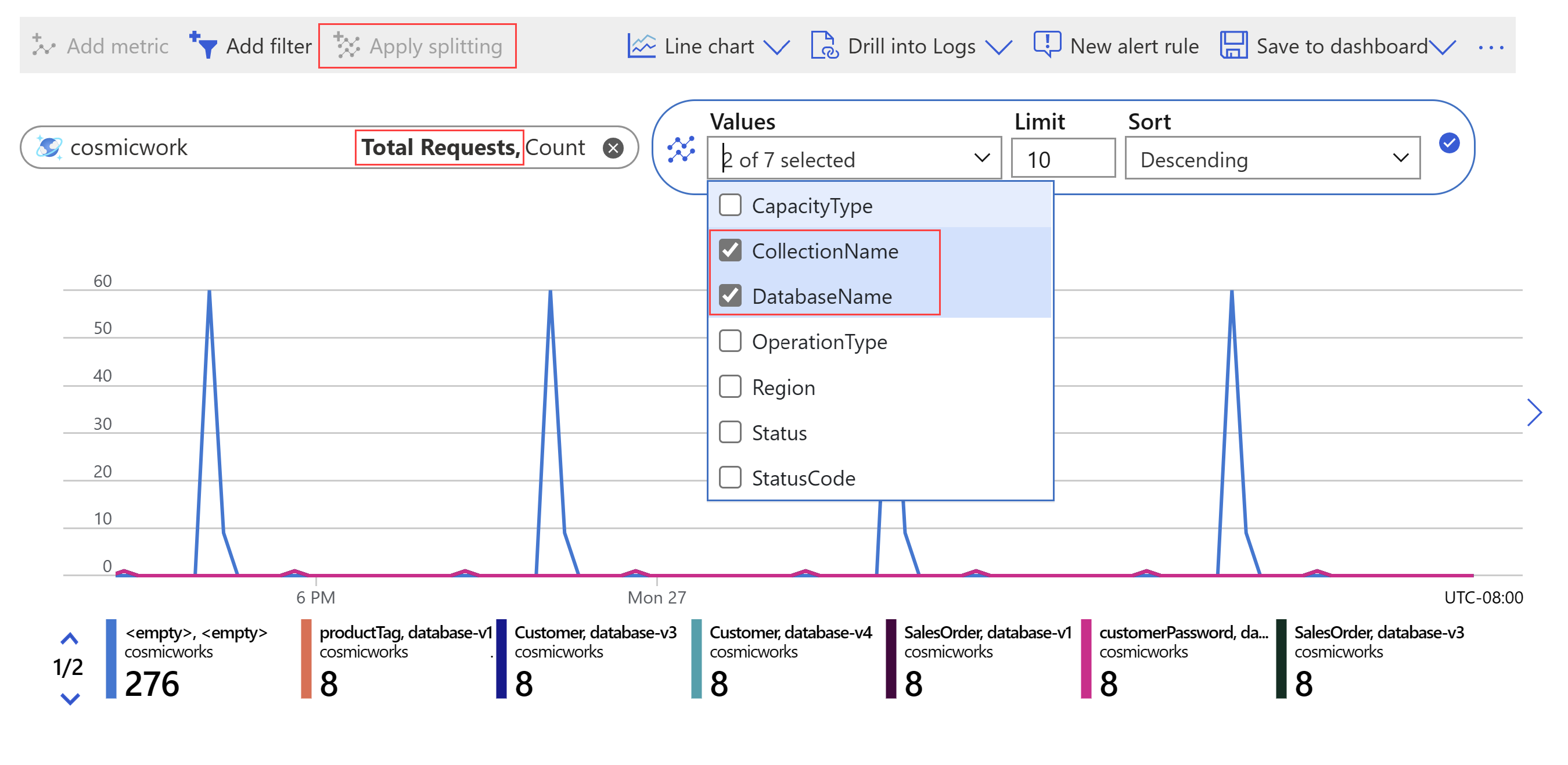 - 분할 적용을 선택하고 값 드롭다운에서 DatabaseName 및 CollectionName 차원을 선택합니다.