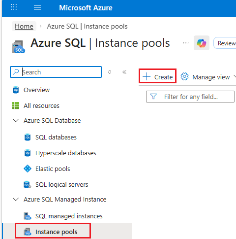 - Azure Portal의 인스턴스 풀 로 이동하여 인스턴스를 만들 풀을 선택하여 풀의 개요를 엽니다.