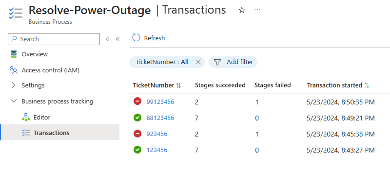 매핑된 표준 논리 앱 워크플로가 실행되고 컬렉션을 위해 지정한 데이터를 내보내면 기록된 트랜잭션을 볼 수 있습니다.