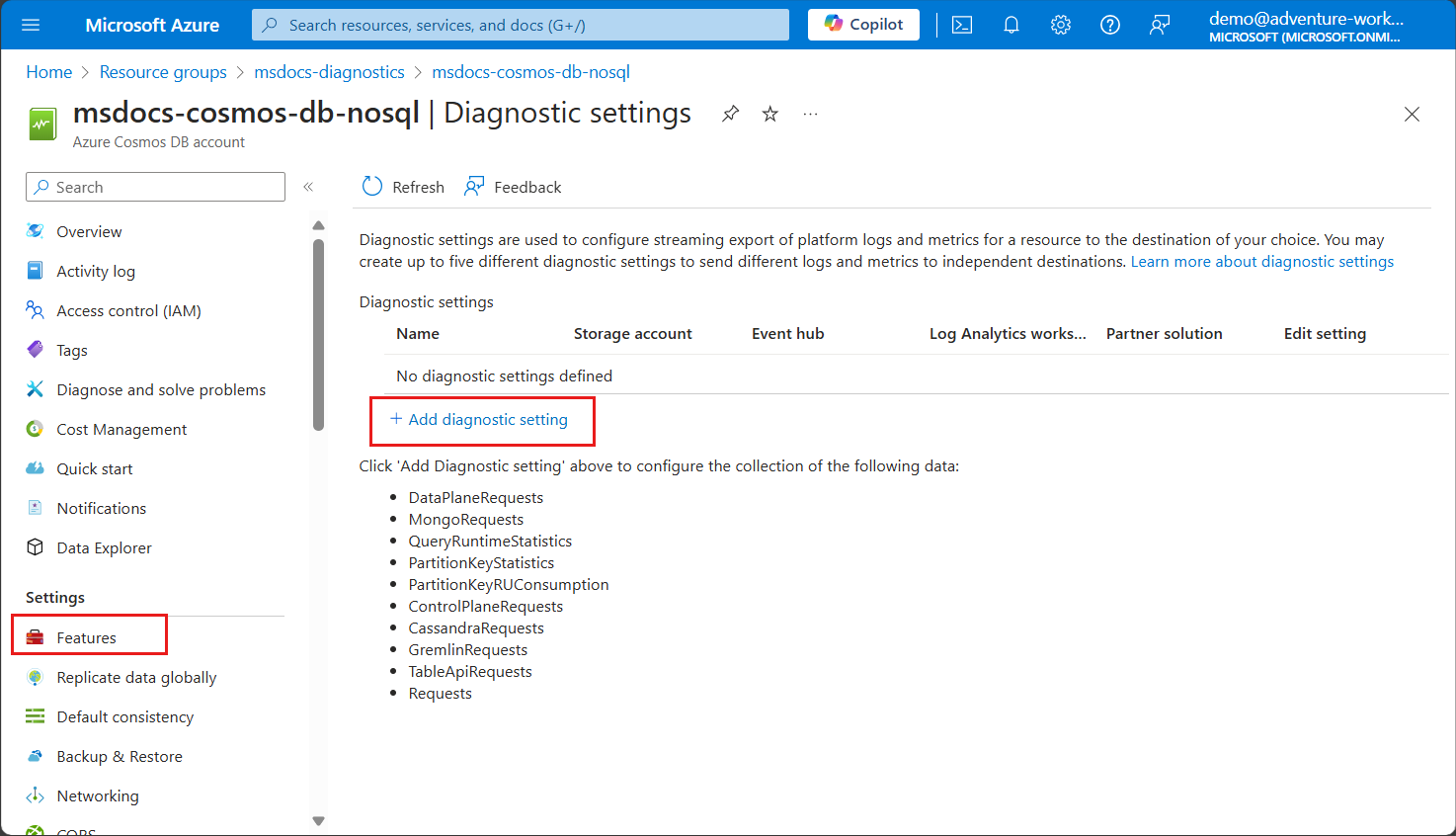 기존 Azure Cosmos DB 계정 페이지에서 리소스 메뉴의 설정 섹션에 있는 기능 옵션을 선택합니다. 그런 다음 진단 전체 텍스트 쿼리 기능을 선택합니다.