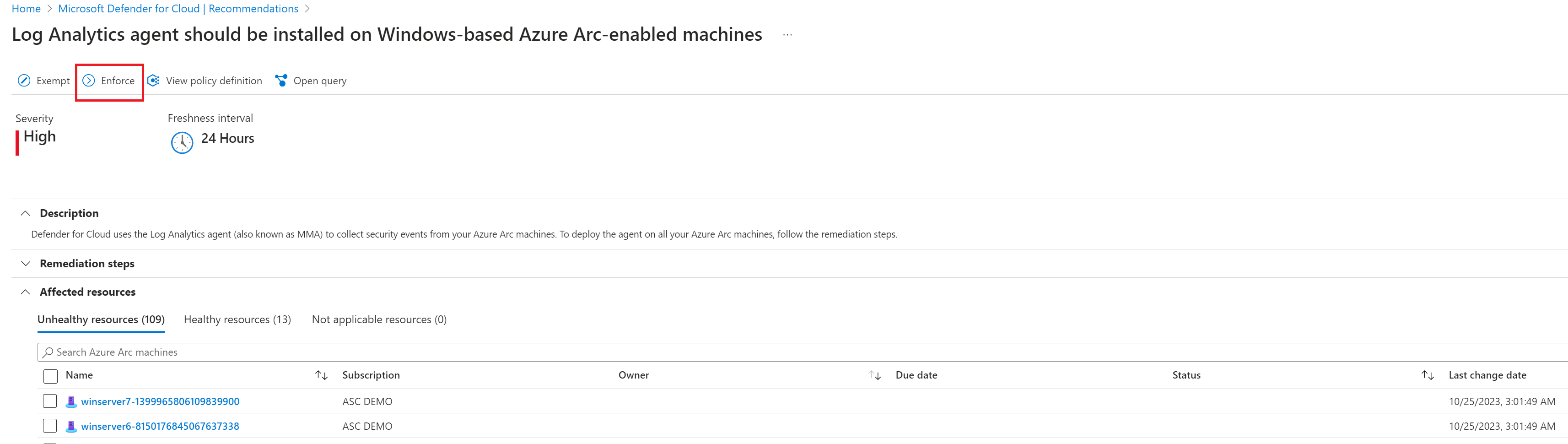 거부 및 적용할 수 있는 권장 사항을 검토하려면 보안 정책 페이지의 표준 탭에서 Microsoft Cloud Security Benchmark를 선택하고 권장 사항을 드릴다운하여 거부/적용 작업을 사용할 수 있는지 확인합니다.