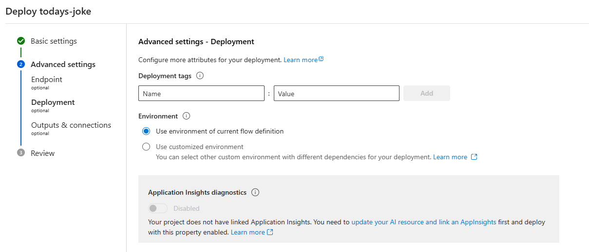 고급 설정 워크플로에서 배포 태그를 지정하고 사용자 지정 환경을 선택할 수도 있습니다.
