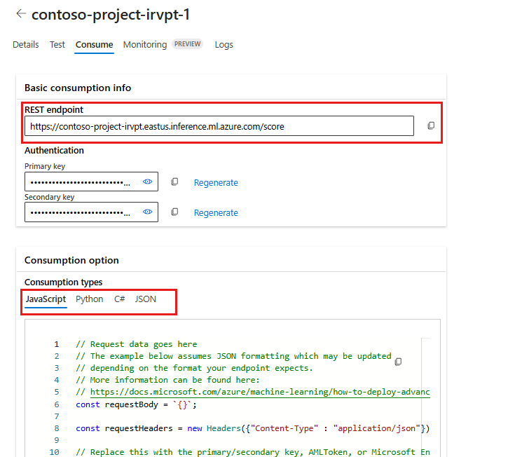 배포 세부 정보 페이지에서 사용 탭을 선택하세요. 여기에서 엔드포인트를 사용하기 위한 REST 엔드포인트와 키/토큰을 찾을 수 있습니다. 다양한 언어로 엔드포인트에 접근할 수 있도록 샘플 코드가 제공됩니다.