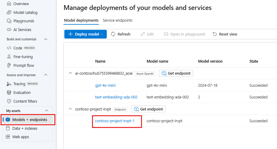 배포 상태를 보려면 왼쪽 창에서 모델 + 엔드포인트 를 선택합니다. 배포를 성공적으로 만든 후 배포를 선택하여 자세한 정보를 확인합니다.