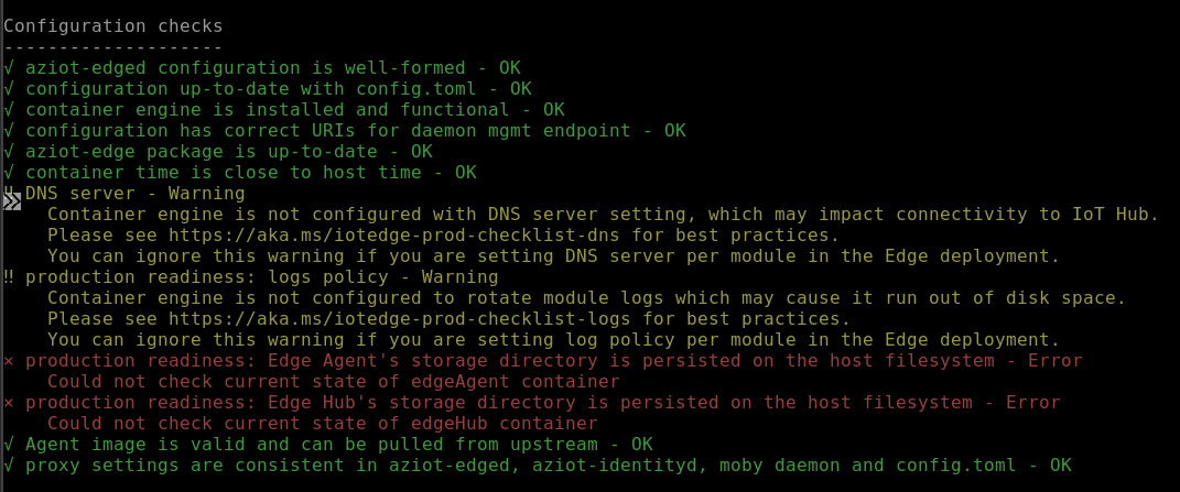 확인(녹색), 경고(노란색) 또는 오류(빨간색)를 포함할 수 있는 응답 범위를 예상할 수 있습니다. 일반적인 오류 문제를 해결하려면 Azure IoT Edge의 일반적인 문제에 대한 솔루션을 참조하세요.
