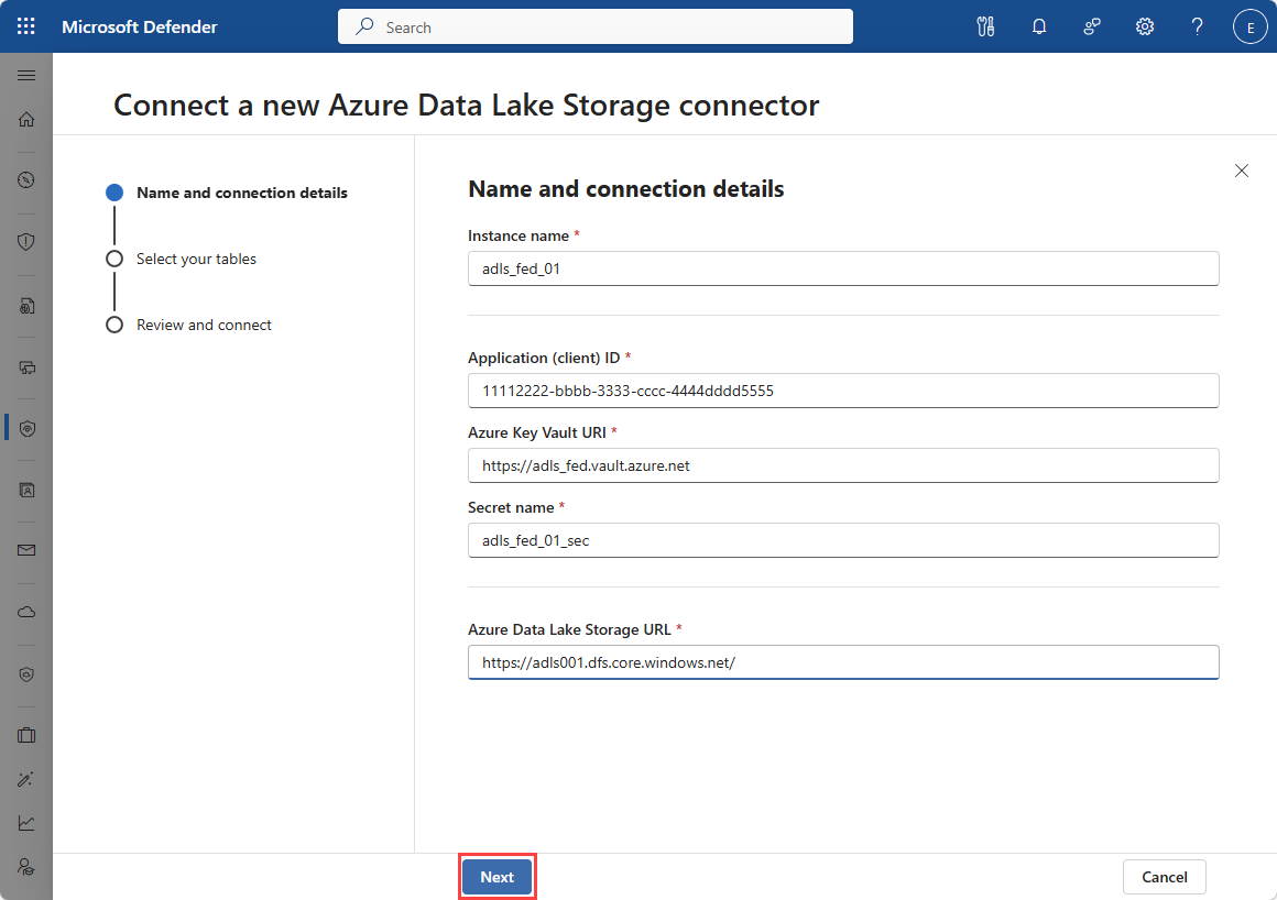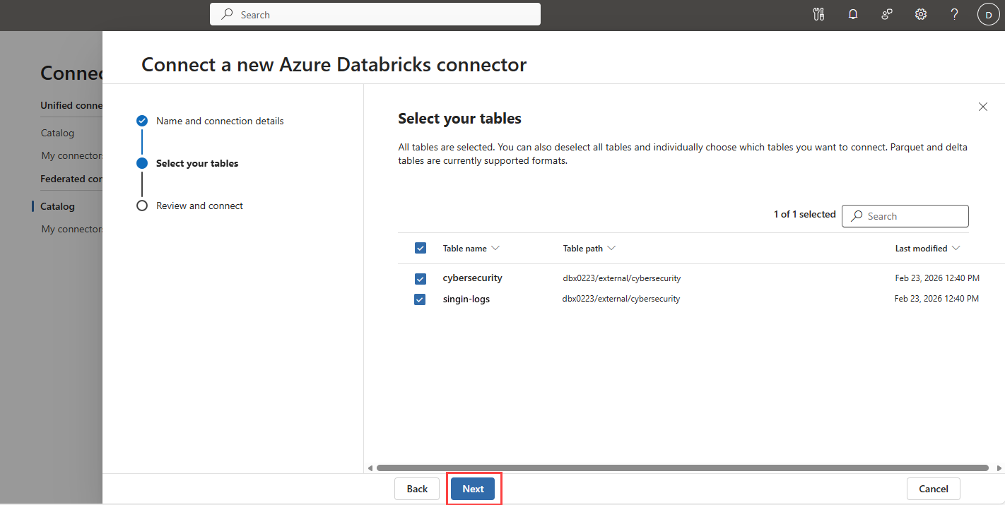 필드 설명 인스턴스 이름 이 커넥터의 이름 instance. 이 instance 이름은 이 instance 레이크에 표시된 테이블에 추가됩니다. 패브릭 작업 영역 ID 페더레이션할 패브릭 작업 영역의 ID입니다. 패브릭 작업 영역 또는 레이크하우스로 이동하면 작업 영역 ID가 URL 다음에 표시됩니다. /groups/Lakehouse 테이블 ID 페더레이션할 패브릭 레이크하우스 테이블의 ID입니다. 패브릭 레이크하우스로 이동하면 레이크하우스 ID가 다음 /lakehouses/URL에 표시됩니다.다음을 선택합니다.