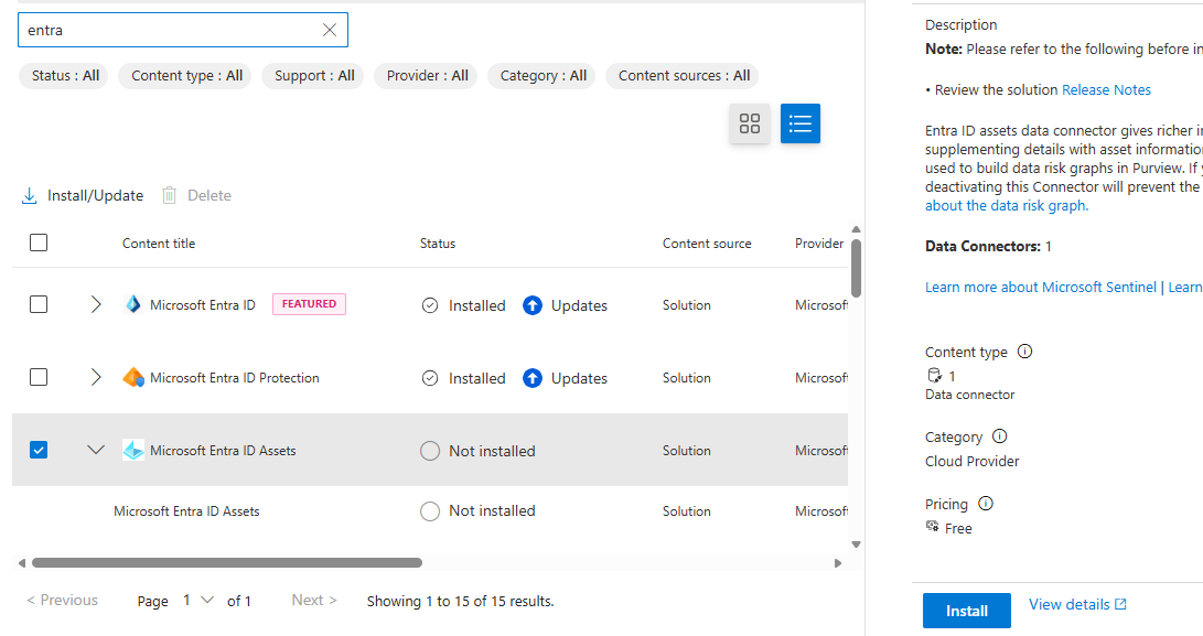 Sentinel 데이터 레이크에 온보딩할 때 자산 데이터 수집은 기본적으로 사용되므로 자산 데이터 수집을 용이하게 하는 자산 Sentinel 데이터 커넥터의 기본 역할을 이해하는 것이 중요합니다. 이러한 데이터 커넥터는 자산 관련 데이터를 Sentinel 데이터 레이크로 가져오는 역할을 하며 해당 Sentinel 솔루션 패키지 내에 번들로 제공됩니다. 콘텐츠 허브를 통해 이러한 솔루션을 검색하고 관리할 수 있습니다.