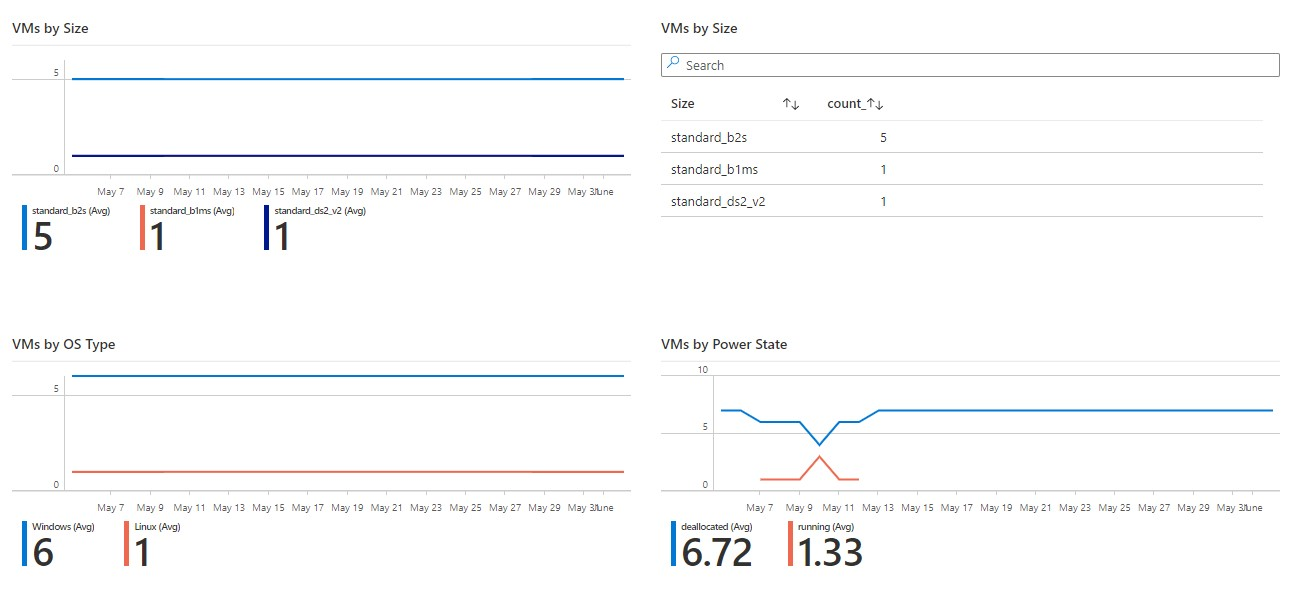 리소스 인벤토리 통합 문서는 기록 진화를 포함하여 다양한 관점에서 가장 관련성이 큰 Azure 리소스 종류(주로 IaaS)의 배포에 대해 보고합니다.