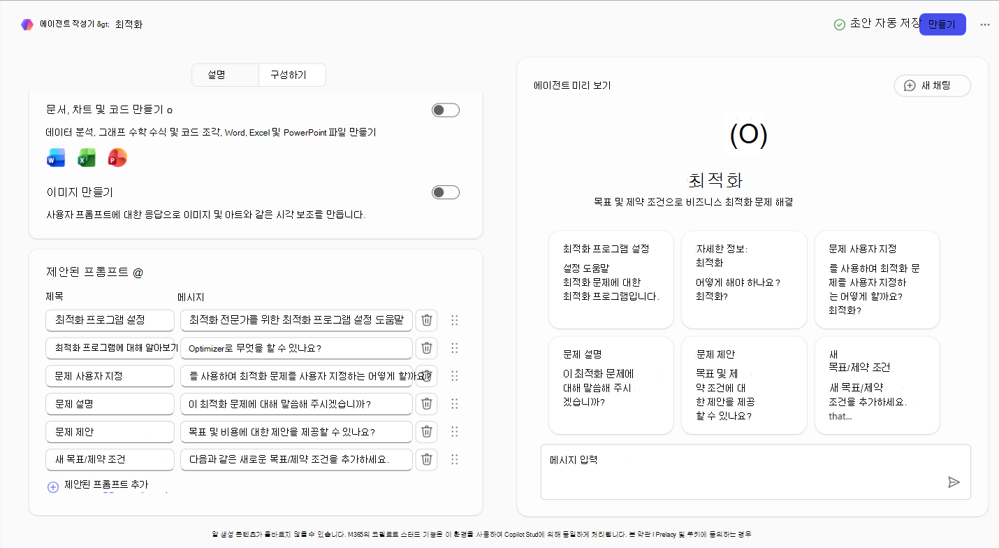 이름, 설명 및 제안된 프롬프트를 제공합니다. 기본 지침은 최적화 에이전트 템플릿에 대해 미리 채워지고 최적화됩니다.