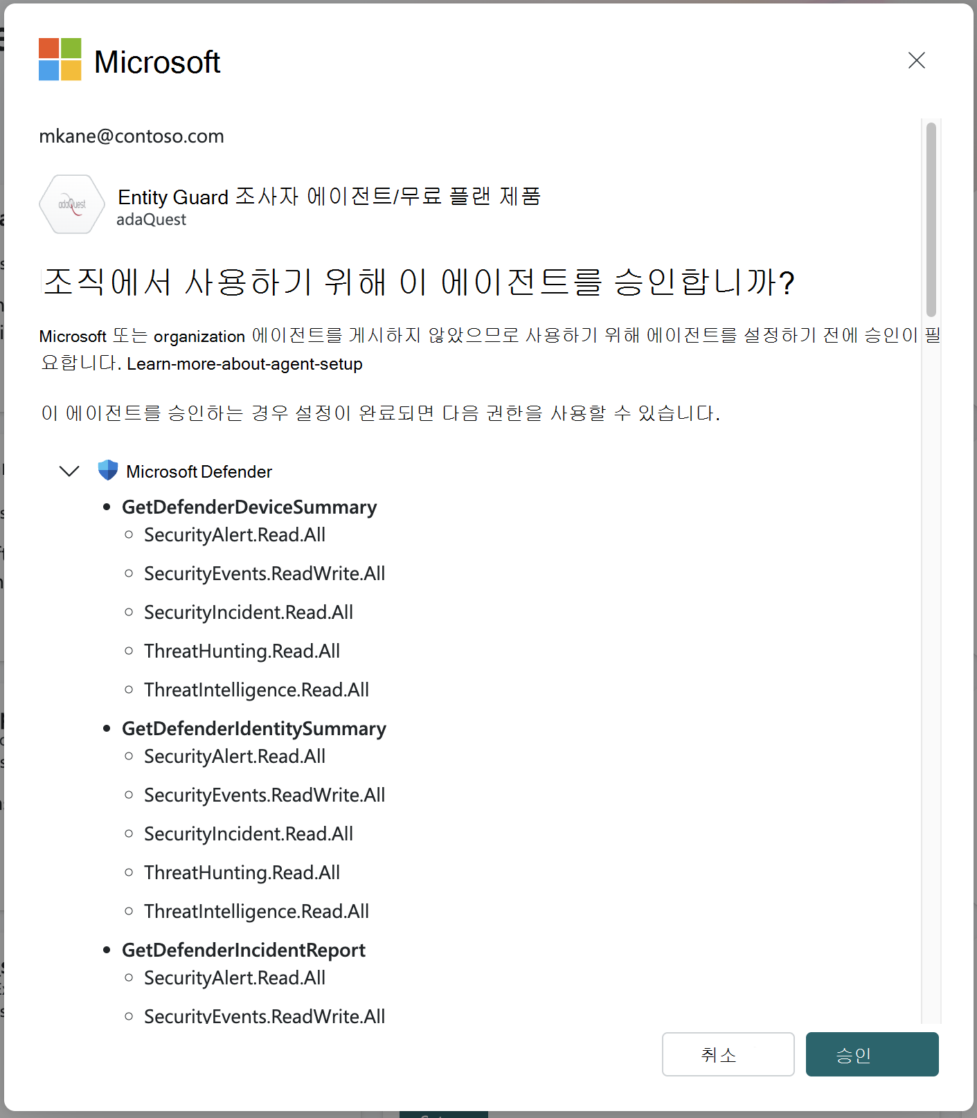 Microsoft 도구(기술)에 액세스하고 Microsoft Intune, Microsoft Entra, Microsoft Sentinel, Defender 또는 Defender 위협 인텔리전스와 같은 Microsoft 제품의 데이터에 액세스하는 파트너 빌드 에이전트를 설정할 때 테넌트 내의 전역 관리자는 에이전트에 필요한 권한의 액세스를 허용하도록 승인해야 합니다.