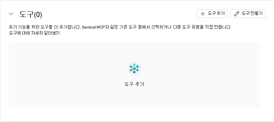 광범위한 Security Copilot 도구 카탈로그에서 도구 추가를 선택하거나 에이전트가 특정 작업을 수행하고 외부 시스템과 상호 작용할 수 있는 도구 만들기를 선택합니다.