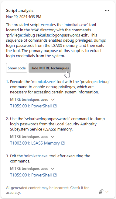 MITRE 기술 표시를 선택하여 스크립트와 연결된 MITRE ATT&CK 기술을 봅니다. 이 정보는 스크립트에서 사용하는 기술과 스크립트가 환경에 미치는 영향을 이해하는 데 도움이 됩니다. MITRE 기술 숨기기를 선택하여 확장을 닫습니다.