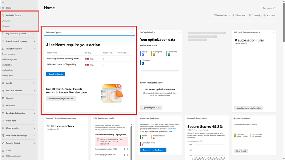 Defender Experts 서비스를 구독하면 Defender 포털 탐색 메뉴에 Defender 전문가가 고유 항목으로 표시됩니다. 이 기능은 포털 전체에서 서비스에 대한 일관되고 예측 가능한 액세스를 제공합니다.