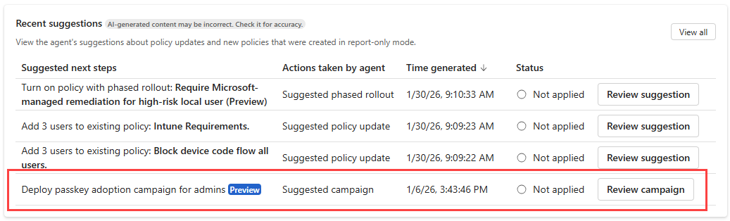 패스키 캠페인을 사용할 수 있는 경우 조건부 액세스 최적화 에이전트 개요에 제안으로 표시됩니다.