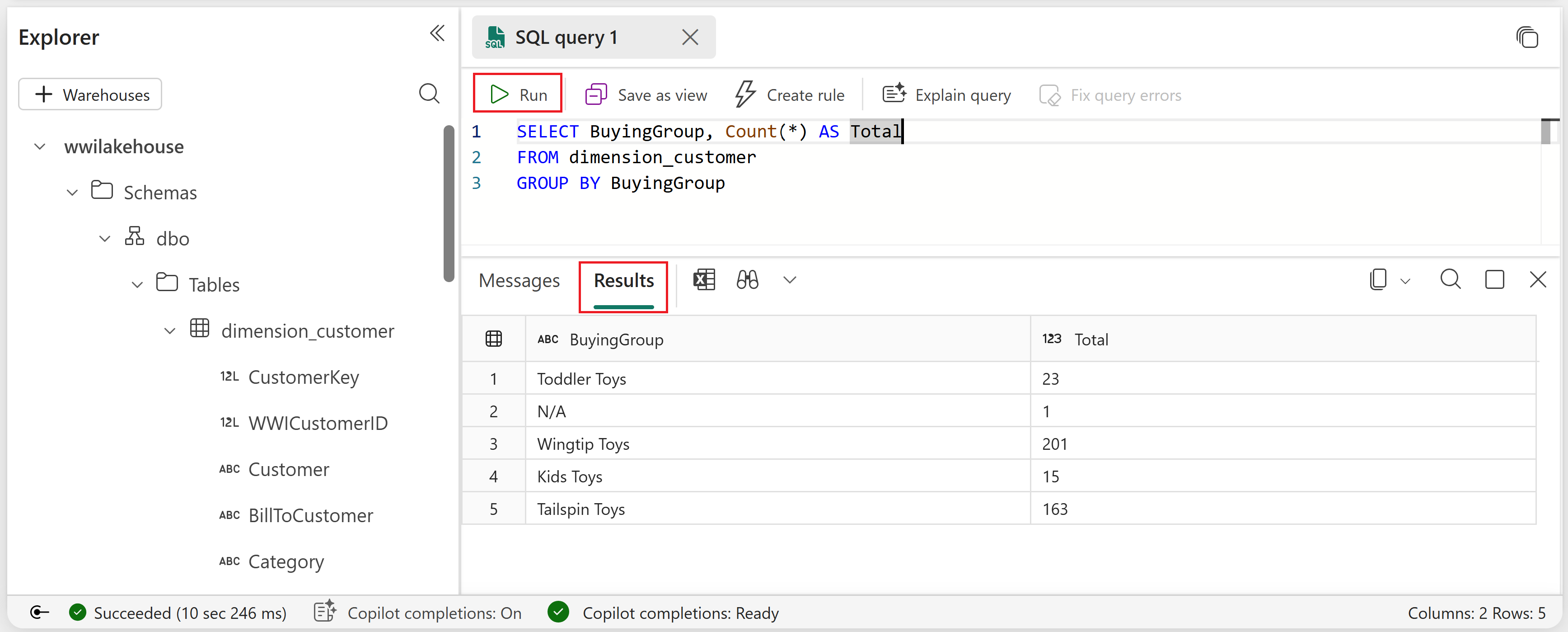 dimension_customer 테이블의 BuyingGroup 열을 기반으로 행 수를 집계하는 다음 샘플 쿼리를 입력합니다.